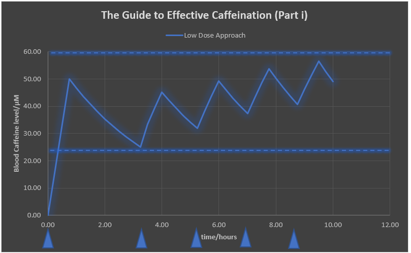 Fig. 1: Low Dose (when you aren’t trying to give yourself a heart attack). Dotted lines show the range of blood caffeine level, while the triangles show when to “top up” your blood caffeine level. The triangles are at slightly different times (as outlined in the guide above) since it wouldn’t make sense to remember the exact times.