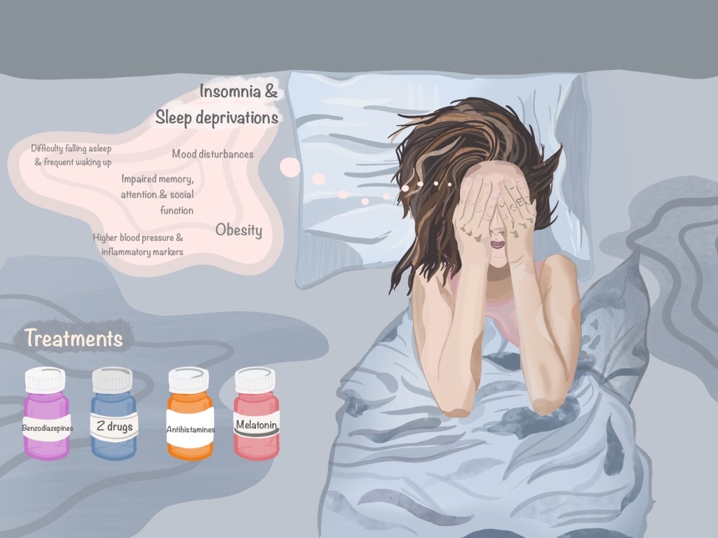 Insomnia treatment aims to improve the quality and quantity of sleep and minimise daytime impairments. The pharmacological treatment includes benzodiazepines, ‘Z drugs’ (zolpidem, zaleplon and eszopiclone), antihistamines and melatonin.