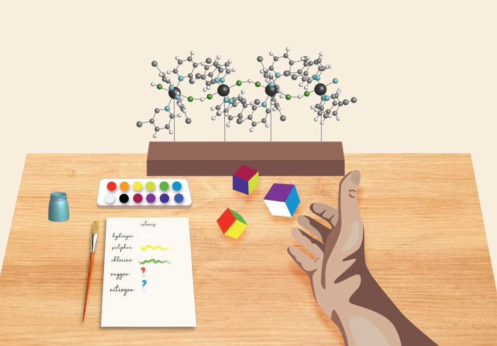 Elements began to be assigned colours in Corey and Pauling’s colouring system. Koltun extended their ideas by continuing to categorise other biological molecules by colour, eventually personalised by modern molecular modelling software such as Jmol and RasMol. A clear inspiration is drawn from the appearance of pure elements; hydrogen, a colourless gas, assigned white, sulphur coloured bright yellow like its powdered form, chlorine aligned with its green gas, and bromine its dark red-brown liquid. Nevertheless, the link is harder to identify for oxygen and nitrogen, red and blue respectively. Potentially, oxygen is portrayed in its haemoglobin-bound form in the blood which has a striking red colour, whereas nitrogen is blue because it is the main component of the atmosphere that our eyes perceive as blue.